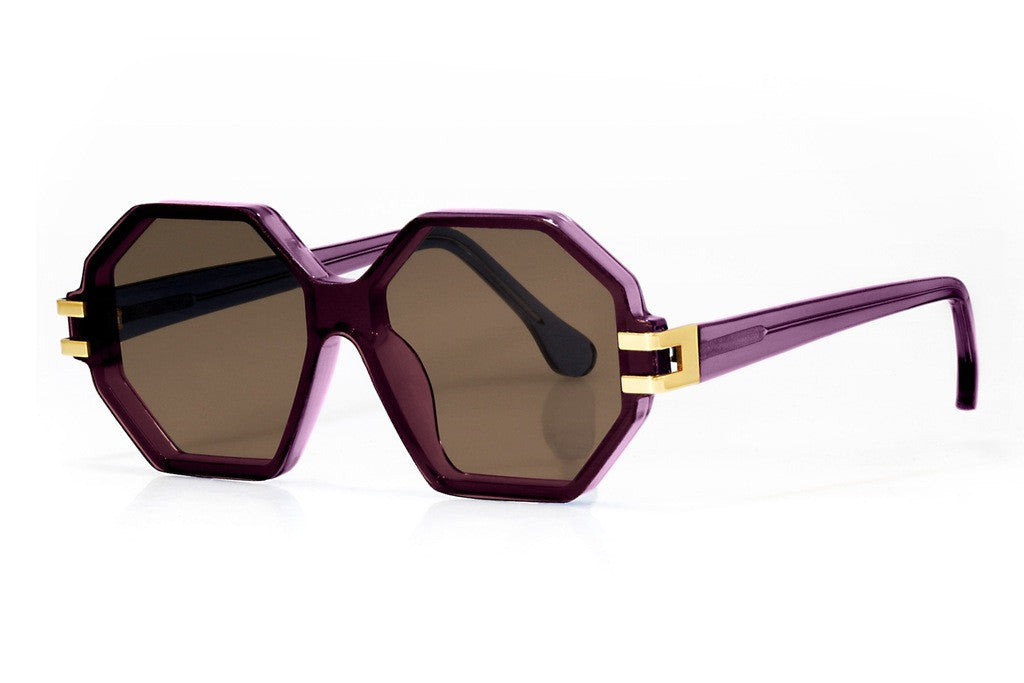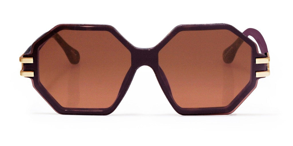 Look no further fashion darlings! This geometric shade is to die for. This is a really different shade whose plastic maroon lens reflect light beautifully around the room. Gorgeous gold accents flank the temples and top off this fantastic frame.