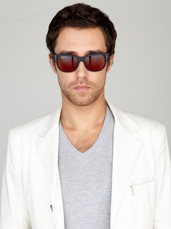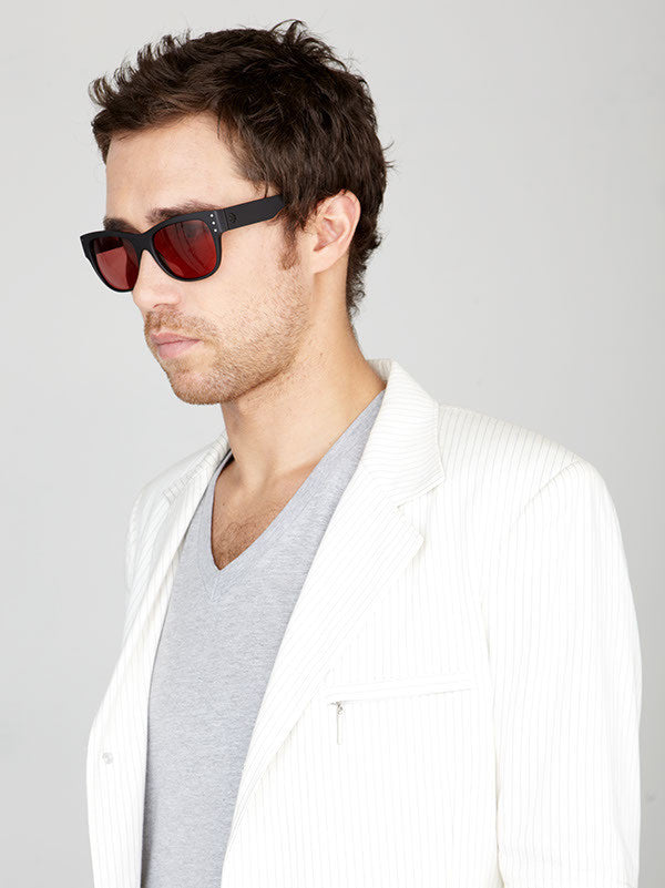 Black shiny acetate contrasts against deep blood red lens. Literally see the world through rose colored glasses!